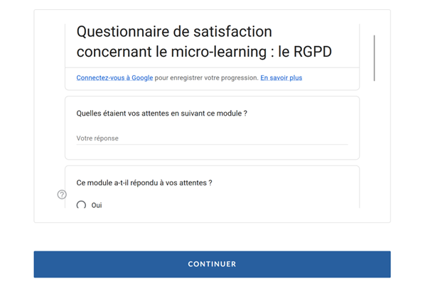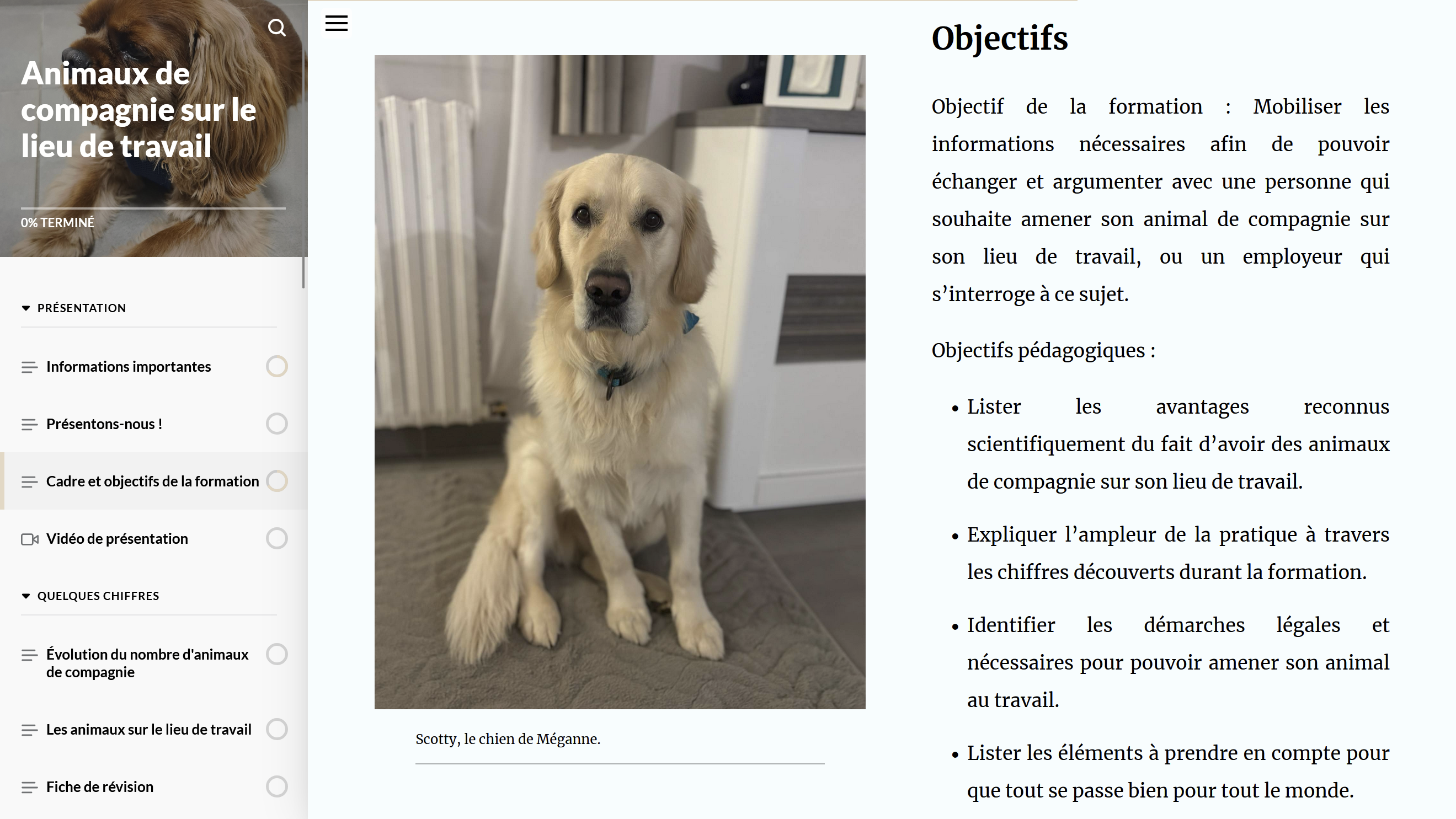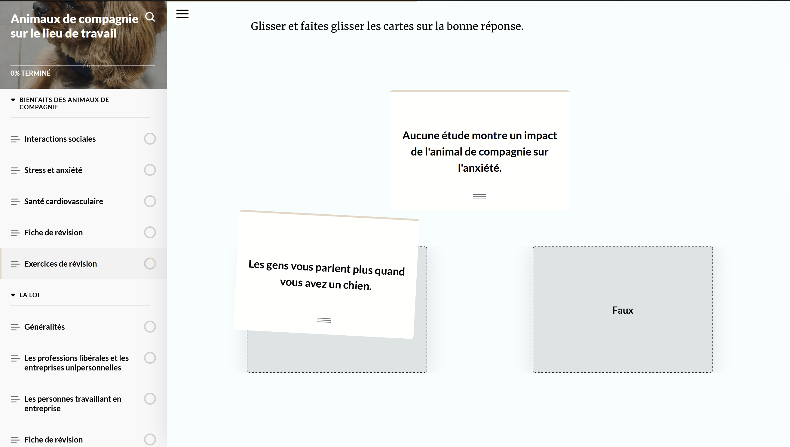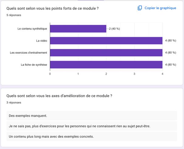 Cet autre projet dure une dizaine de minutes. Il est réalisé sur un modèle similaire au précédent. Il contient donc : une vidéo pédagogique, des exercices formatifs, une fiche de synthèse et un quiz d’évaluation. Par ailleurs, un questionnaire de satisfaction permet d'affiner le profil des apprenants, que ce soit au niveau de leur motivation ou de leur appétence pour les activités proposées.