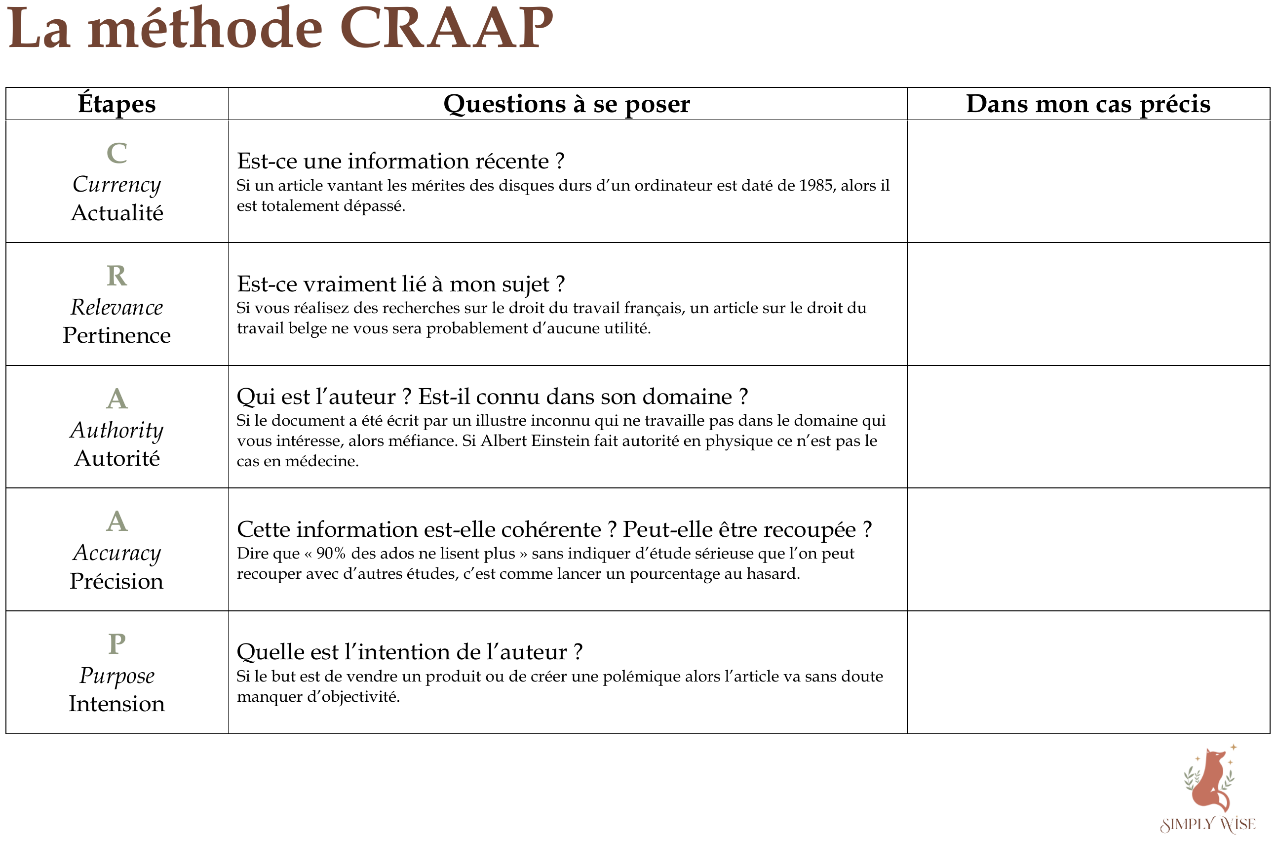 Une veille pertinente repose toutefois sur un esprit critique rigoureux ; c’est pourquoi je m'appuie également une grille d’évaluation de la fiabilité des sources, fondée sur la méthode reconnue CRAAP, développée par la documentaliste Sarah Blakeslee de la bibliothèque Meriam Library de la California State University, Chico.